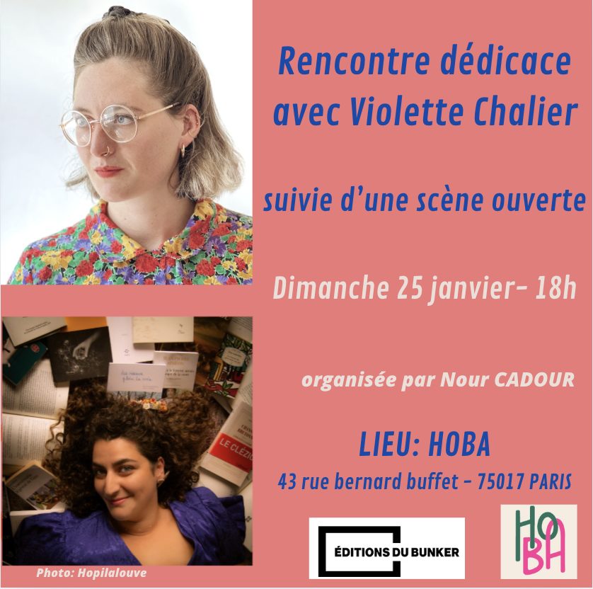 Nour CADOUR, poétesse et romancière, organise des cycles d’événements poétiques au HOBA afin de faire découvrir de belles voix poétiques contemporaines.
